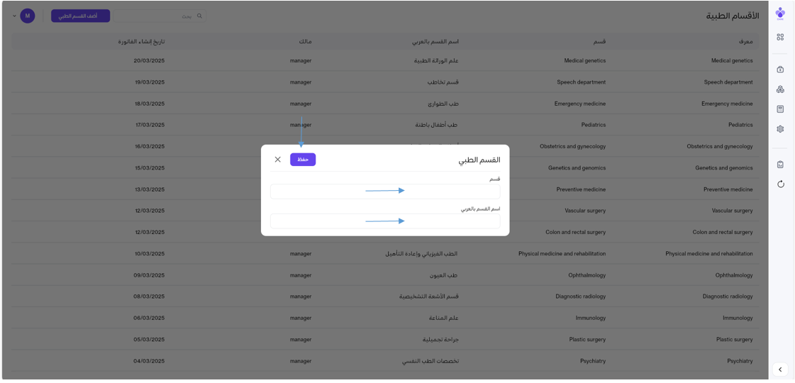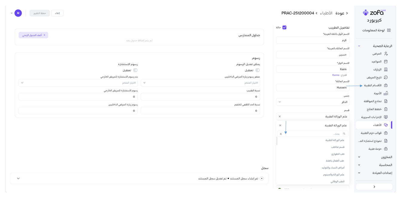 سنلاحظ اسم القسم ظهر في خانة الاقسام لربطه بالطبيب