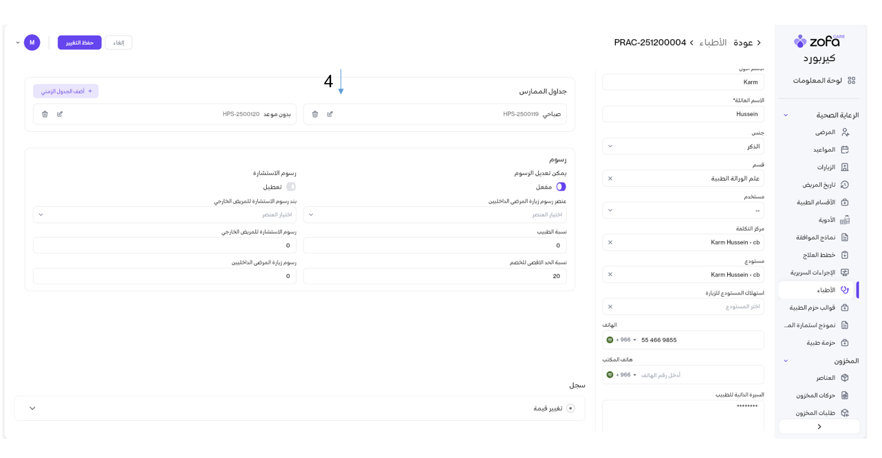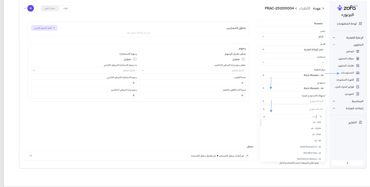 سنلاحظ اسم المستودع ظهر في خانة المستودع لربطه بالطبيب
