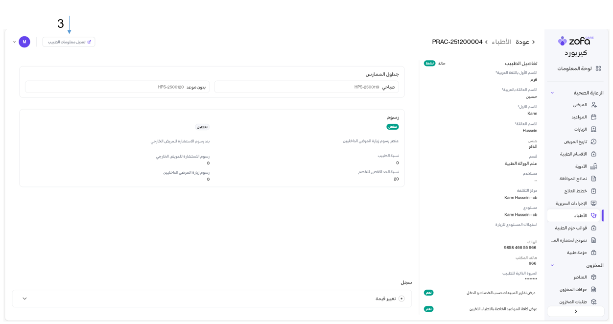 :تعديل ملف الطبيب باستخدام الخطوات التالية
