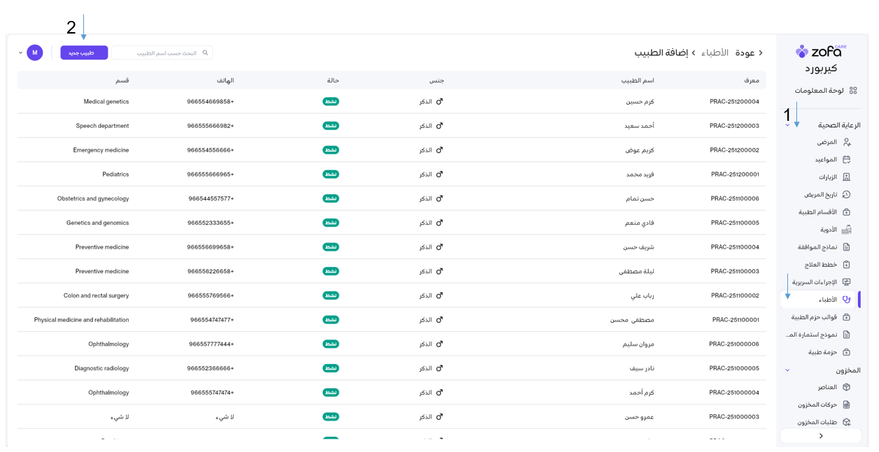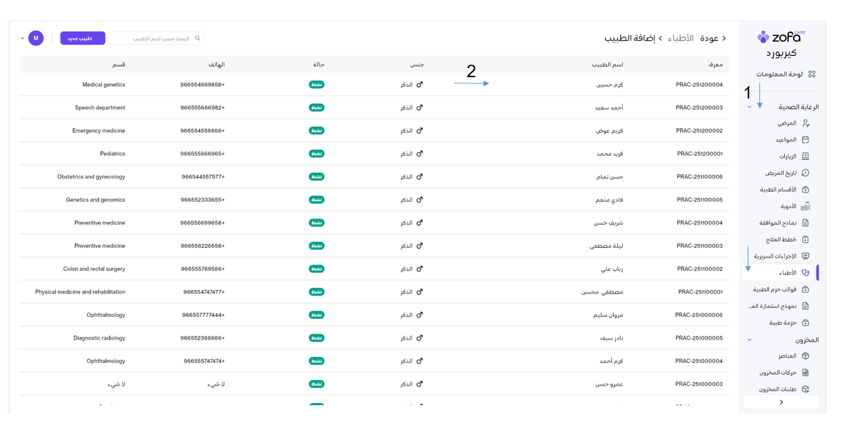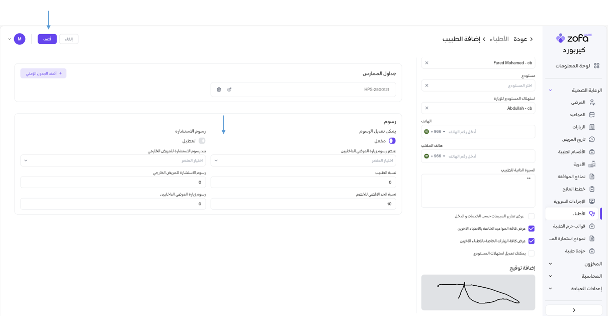 اضافه طبيب باستخدام الخطوات التالية، هذا هو الترتيب المقترح لإضافة الأطباء: