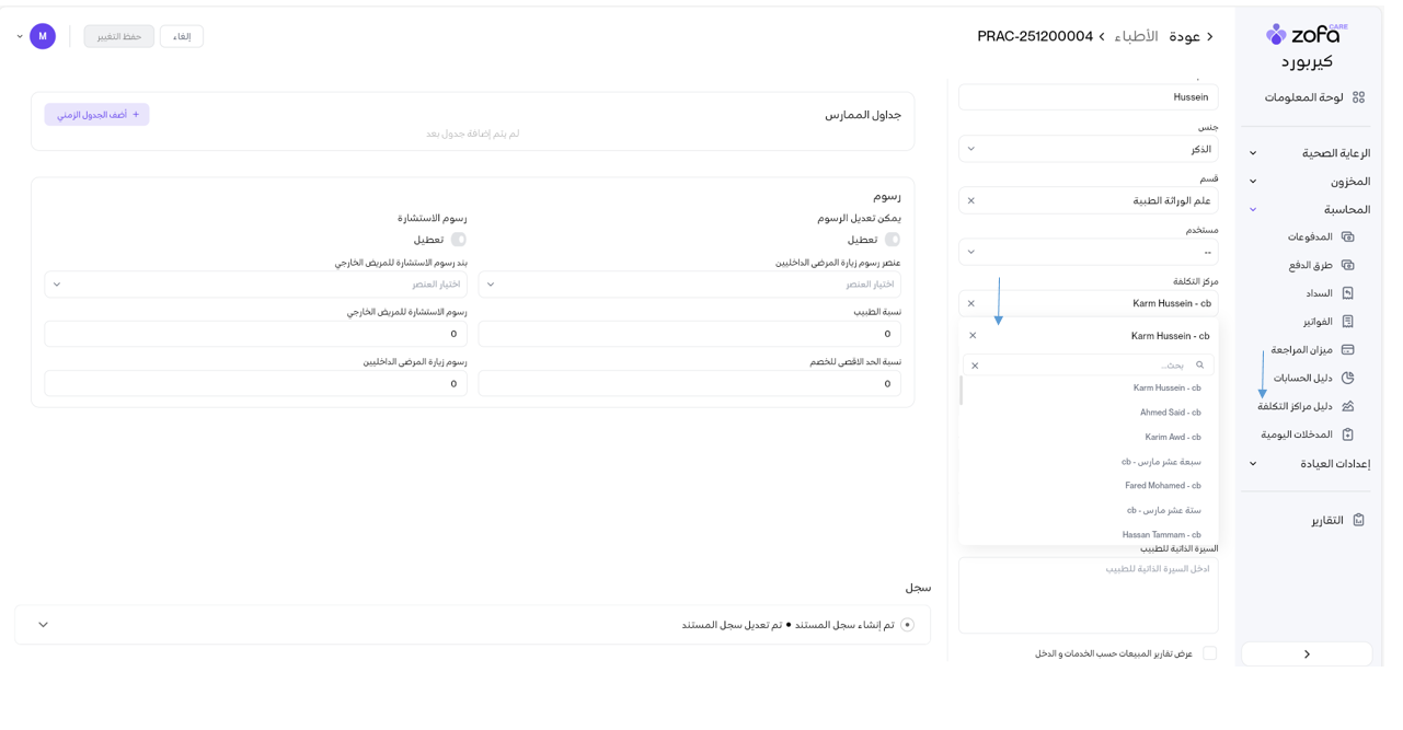 سنلاحظ اسم مركز التكلفة ظهر في خانة مركز التكلفة لربطه بالطبيب