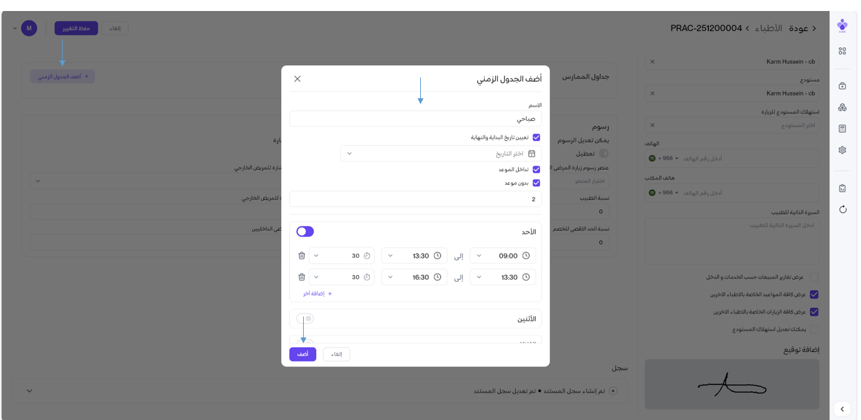 ثم حدد مواعيد العمل وتاريخ البدء والنهاية إذا كان هناك فترة زمنية محددة للطبيب