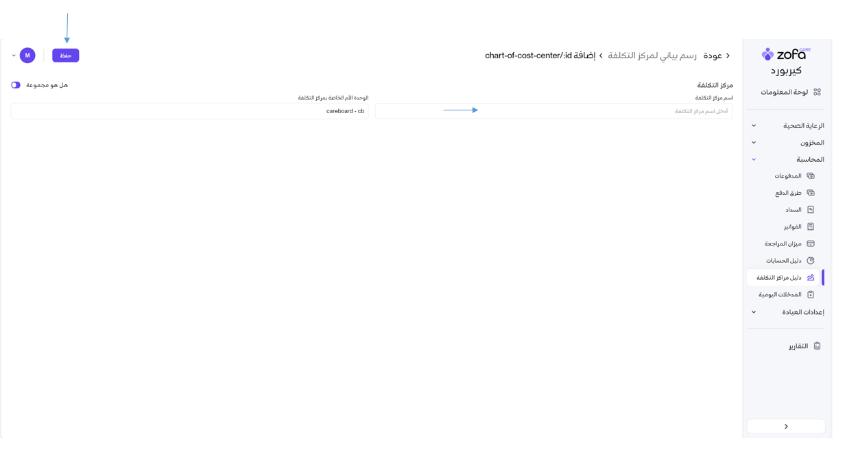 - ثم إدخال اسم مركز التكلفة و الضغط على حفظ