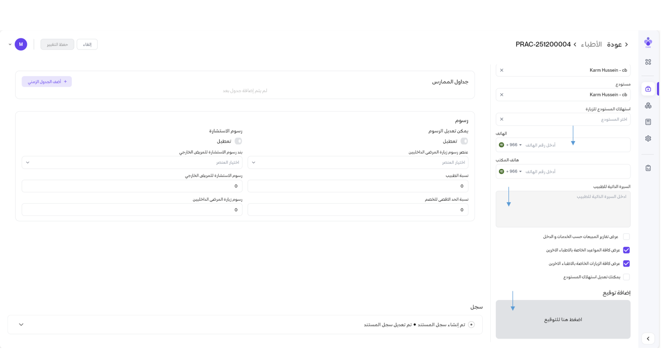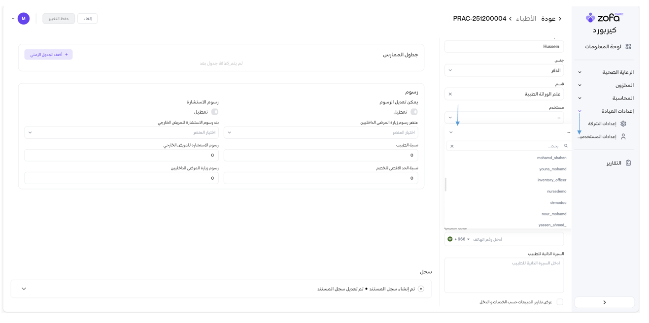 سنلاحظ اسم المستخدم ظهر في خانة المستخدم لربطه بالطبيب