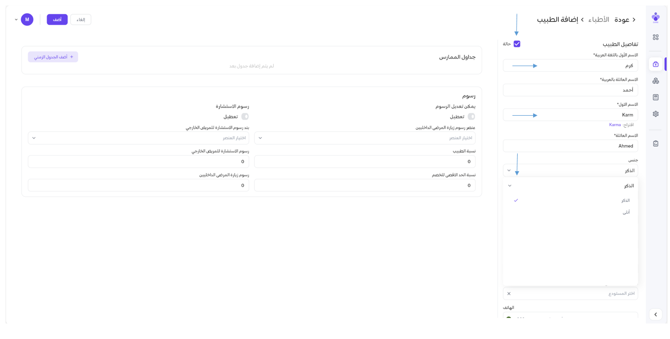 ادخل تفاصيل الطبيب من اسم الطبيب ثنائي عربي و انجليزي ثم تحديد الجنس