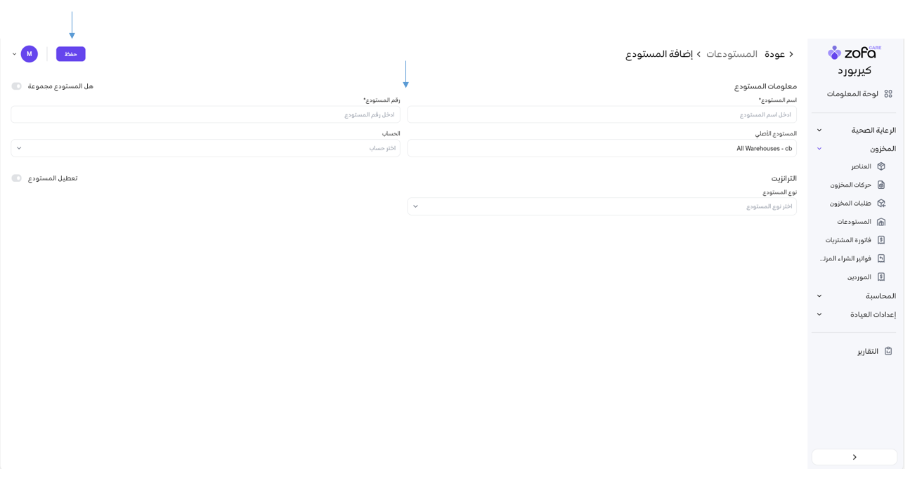 - ثم إدخال اسم و رقم المستودع ثم الضغط على حفظ