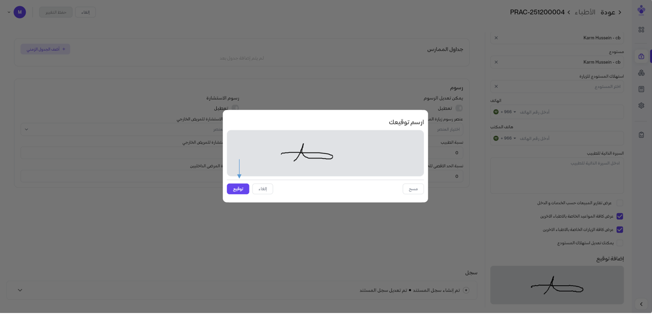 - إضافة توقيع الطبيب من خلال الضغط عليها