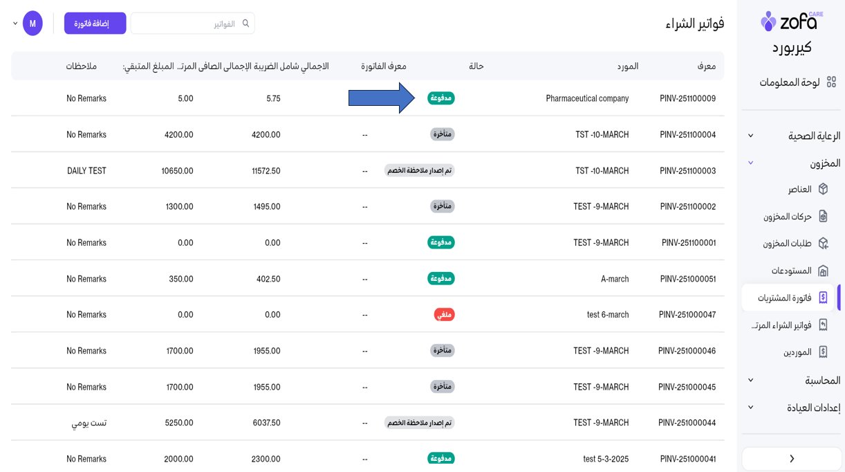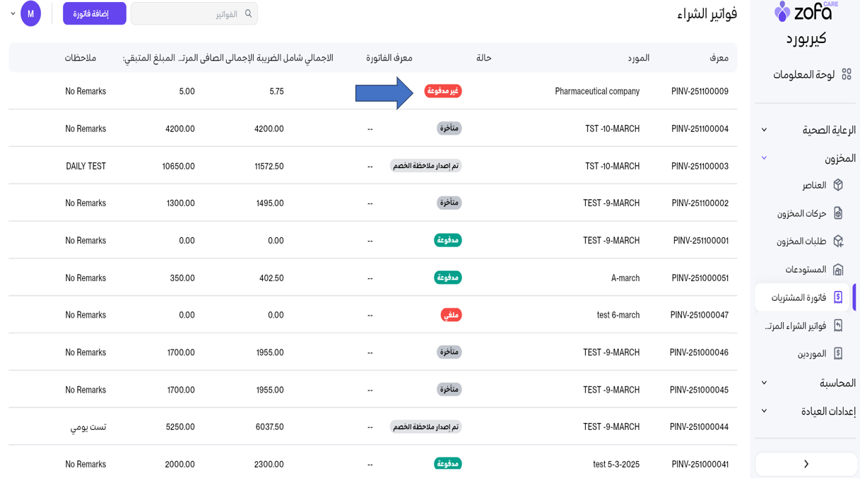 الان بعد عمل ارسال لفاتورة المشتريات المسودة ستصبح حالتها (غير مدفوعة)