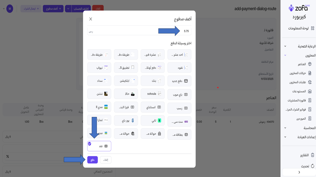 -أضف مدفوعة والتي من خلالها نتمكن من دفع الفاتورة جزئيا على دفعات او كليا على مرة واحده