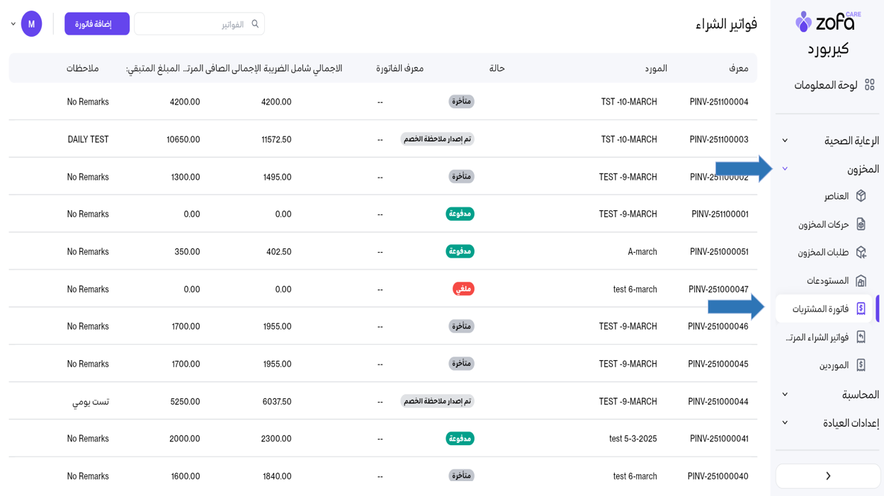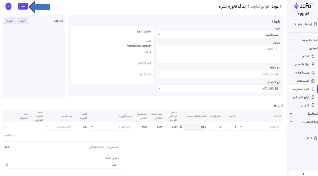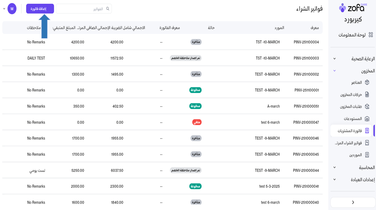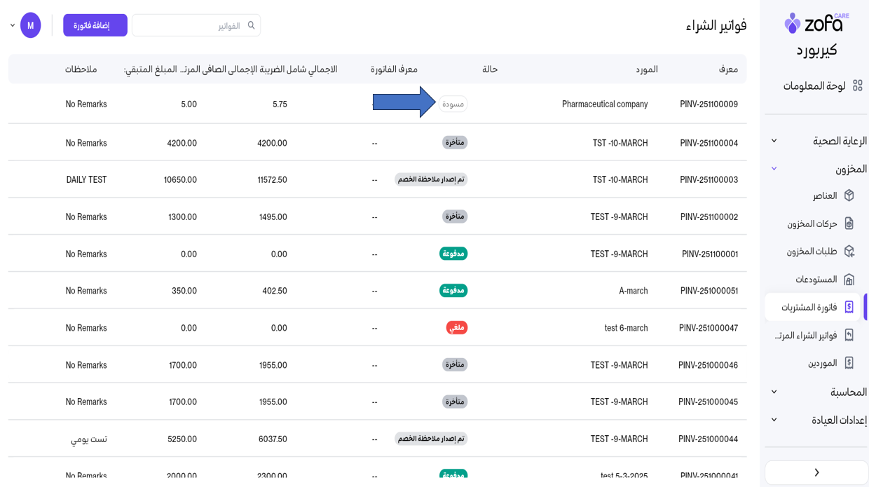 -الان تم حفظ فاتورة المشتريات في حالة مسودة