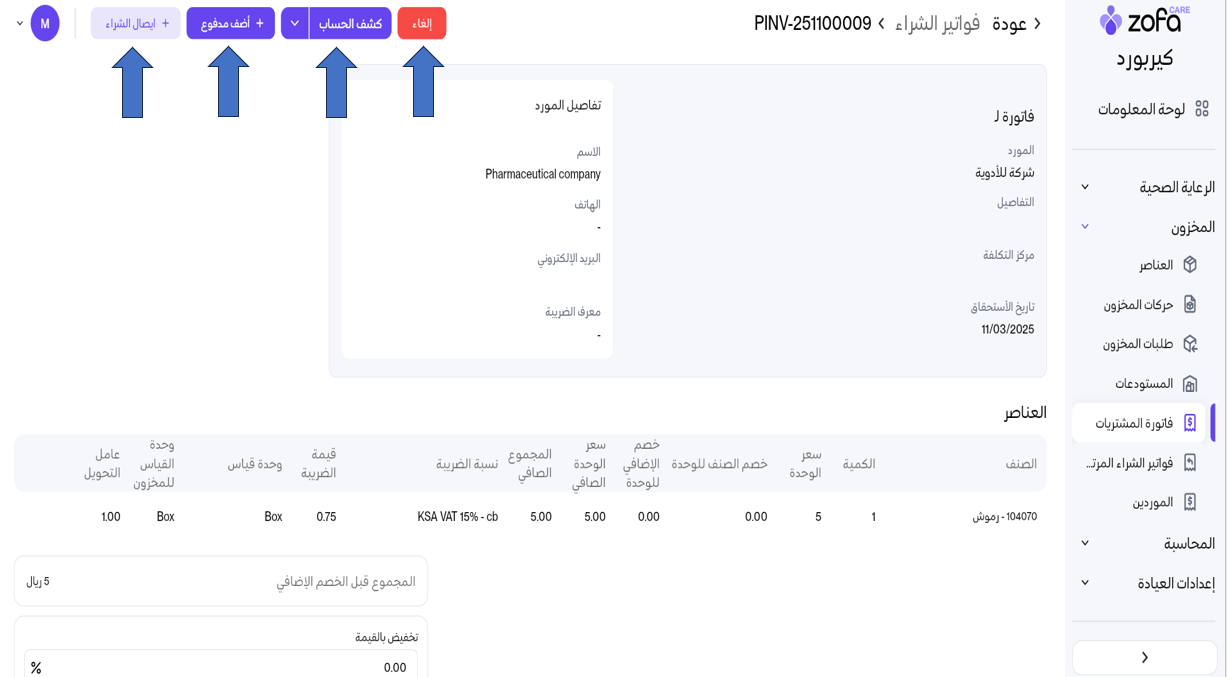 عند الضغط على فاتورة المشتريات وهي بحالة (غير مدفوعة) سنتمكن من الاتي :