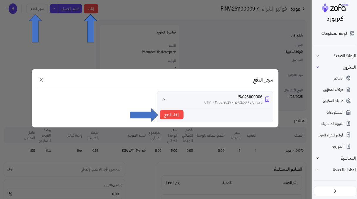 -عند الضغط على الفاتورة المدفوعة سنتمكن من رؤية سجل الدفع وبالضغط عليه يمكننا الغاء الدفعة التي نريدها وسنجد ايضا زر الغاء اذا اردنا الغاء الفاتورة من الاساس