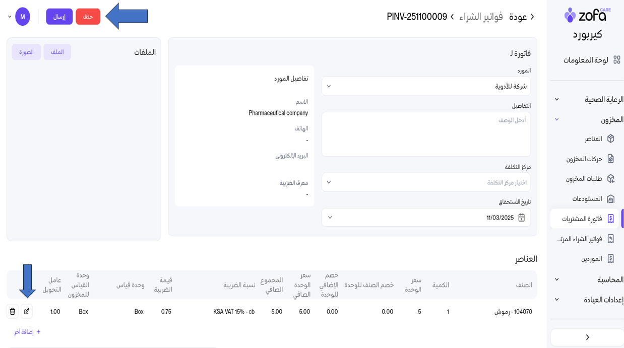 عند الضغط على فاتورة المشتريات وهي بحالة مسودة نتمكن من الاتي: