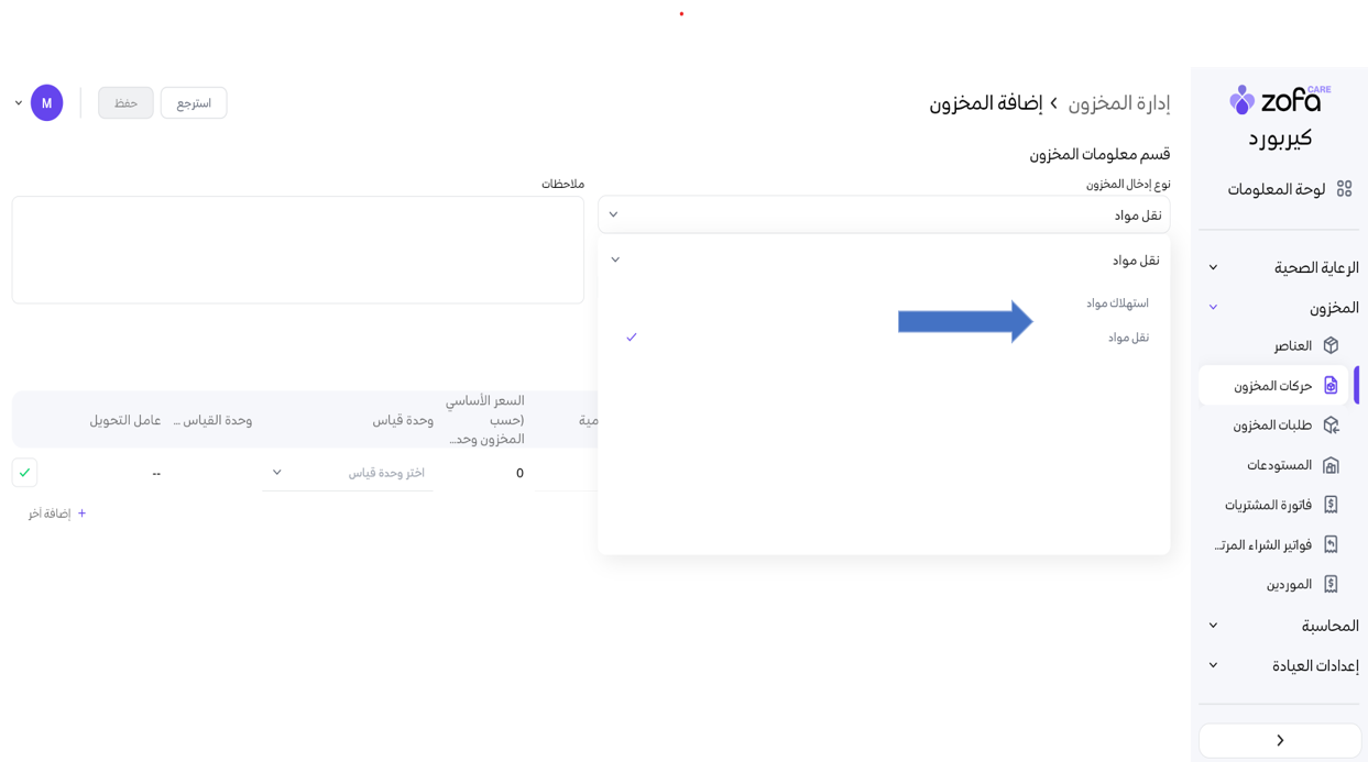 - ثم اختيار نوع المنتج - اختيار المستودع المصدر- مركز التكلفة