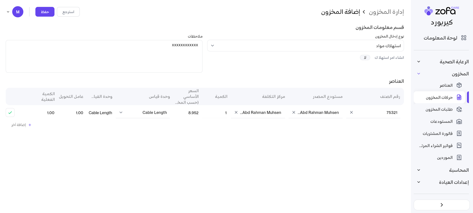 - ثم اختر المنتج و اختر المستودع و مركز التكلفة