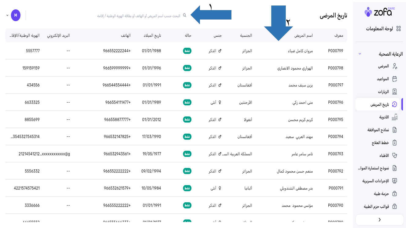 - اختر المريض او من خلال البحث عن ملف المريض المراد معرفة تاريخه