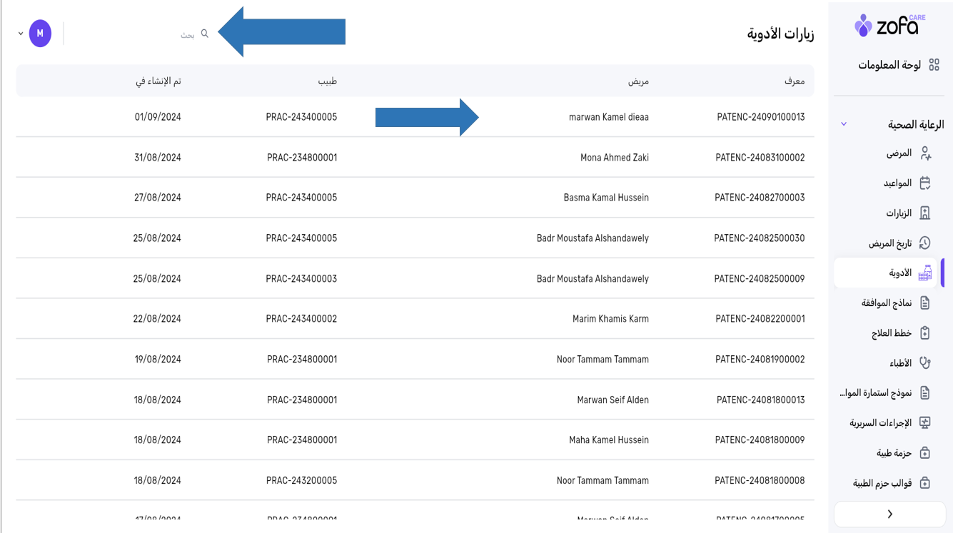 نختار المريض المراد معرفة الادوية التي كتبها الطبيب له