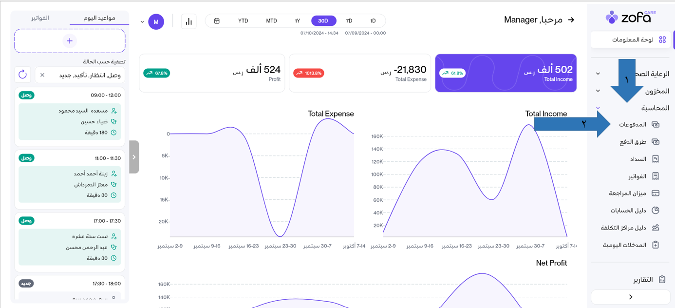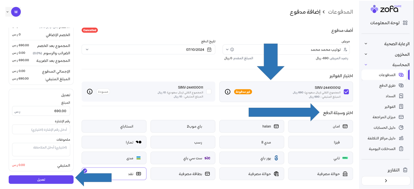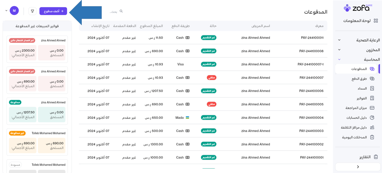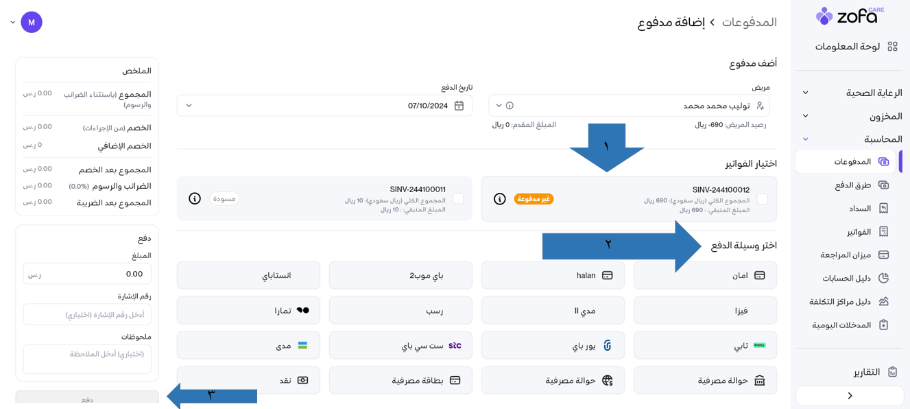 أولا سنقوم بدفع اي فاتورة على سبيل المثال لمريض معين من خلال: