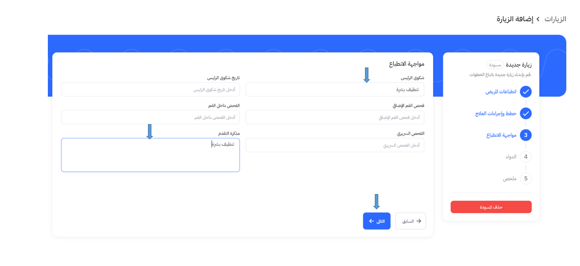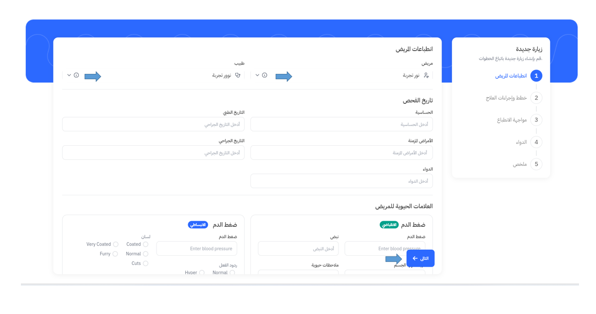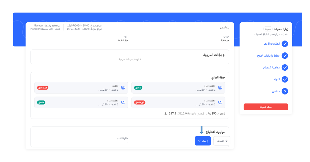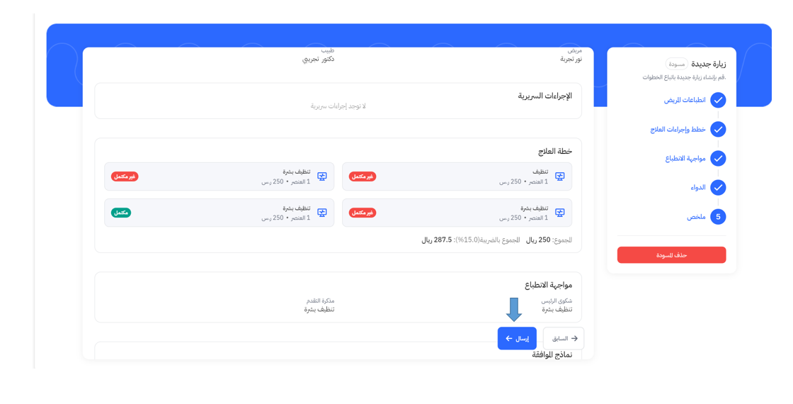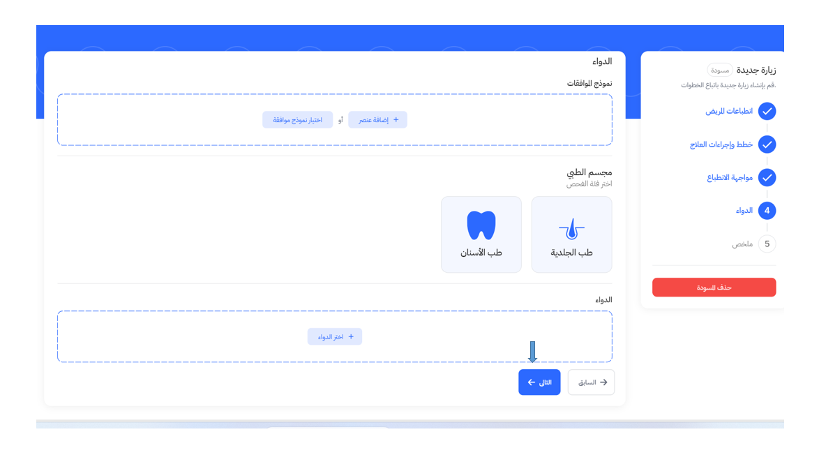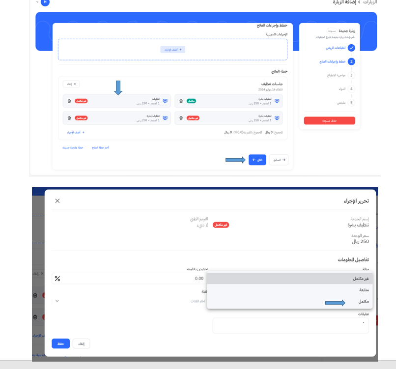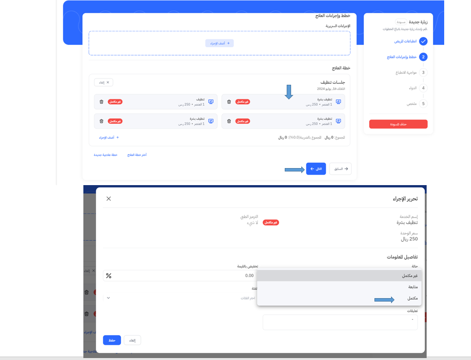 سوف نلاحظ ان المريض لديه اربع جلسات غيرمكتملة ، اختار اول جلسة و سوف تقوم بتغيير الحالة لمكتملة ثم اضغط على حفظ ثم التالي.