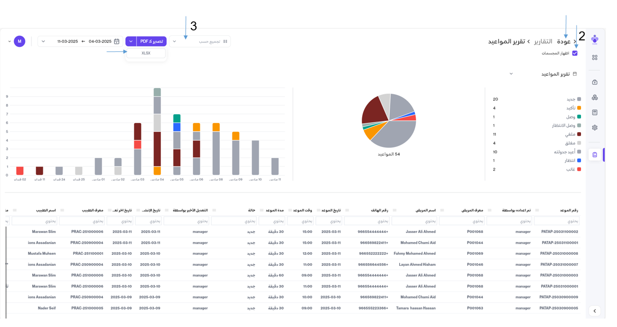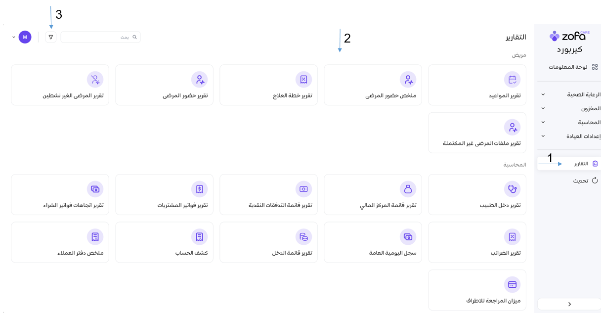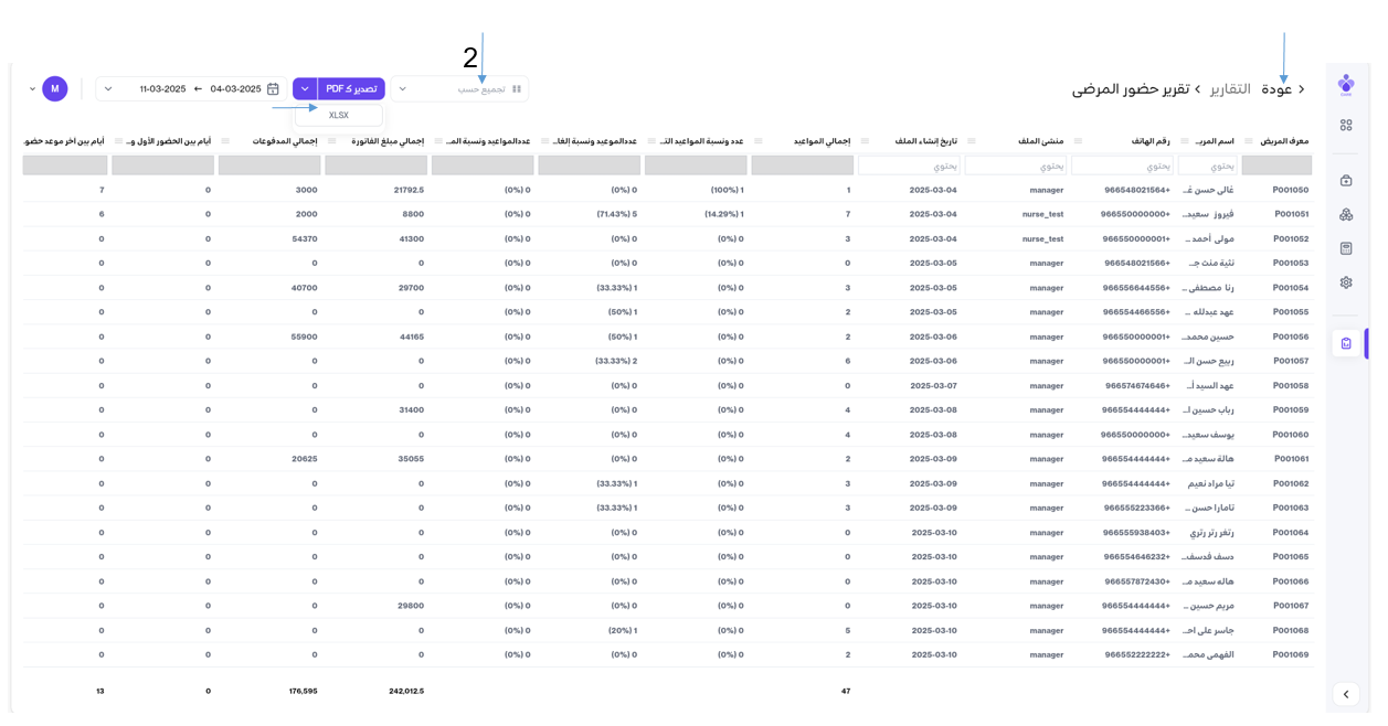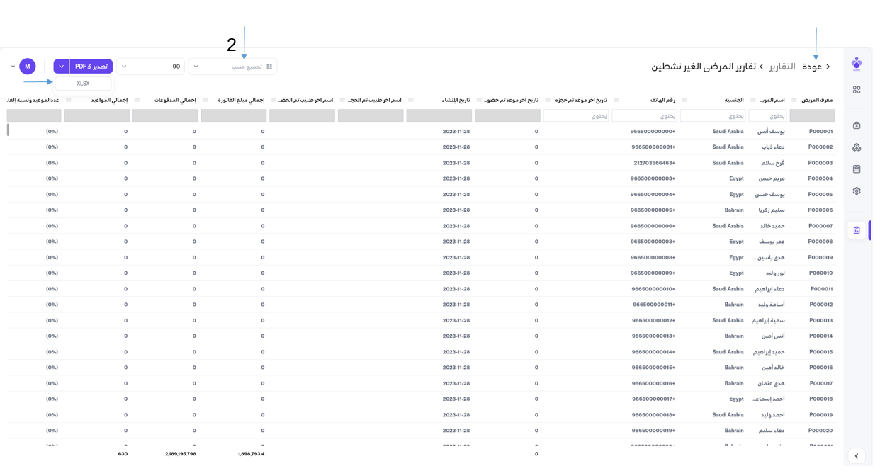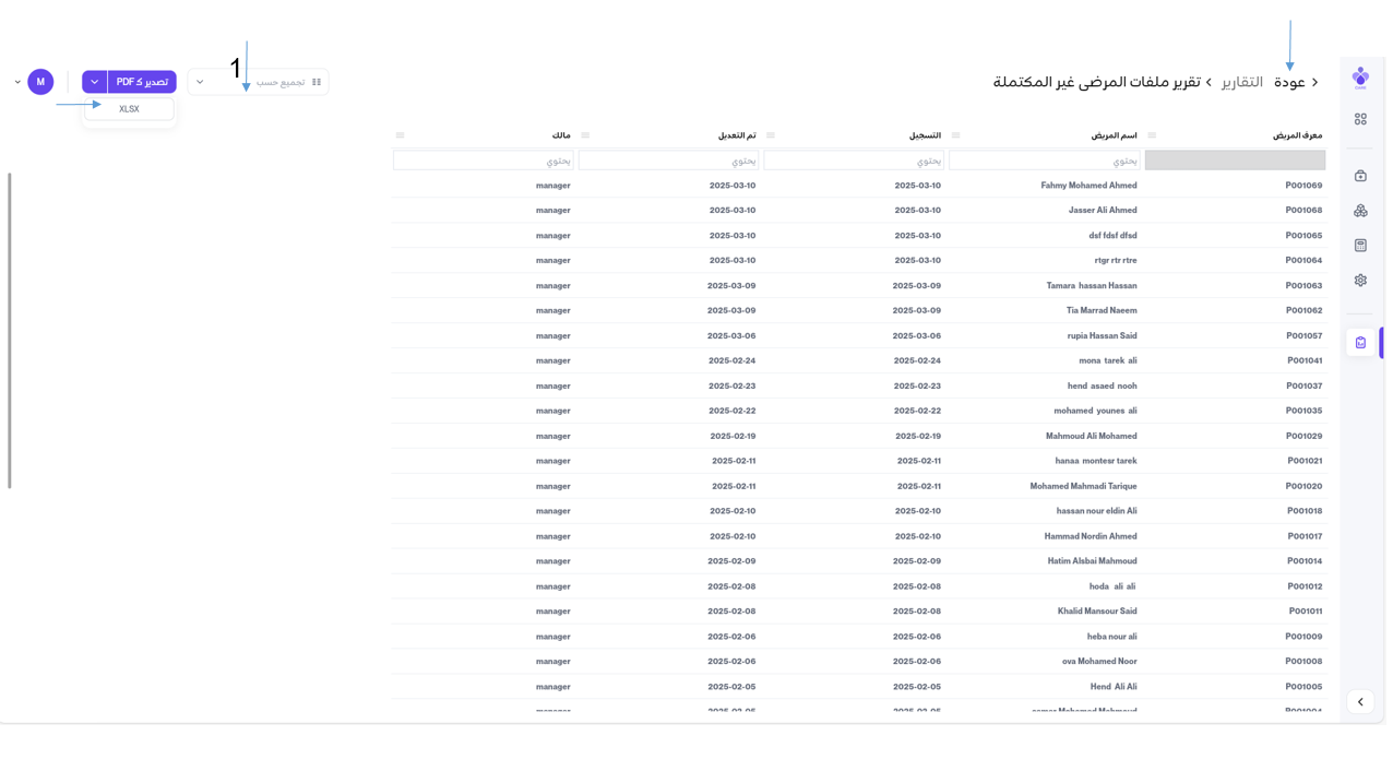 1- حيث يمكنك إظهار التقرير حسب معرف المريض و التسجيل و تم التعديل و المالك