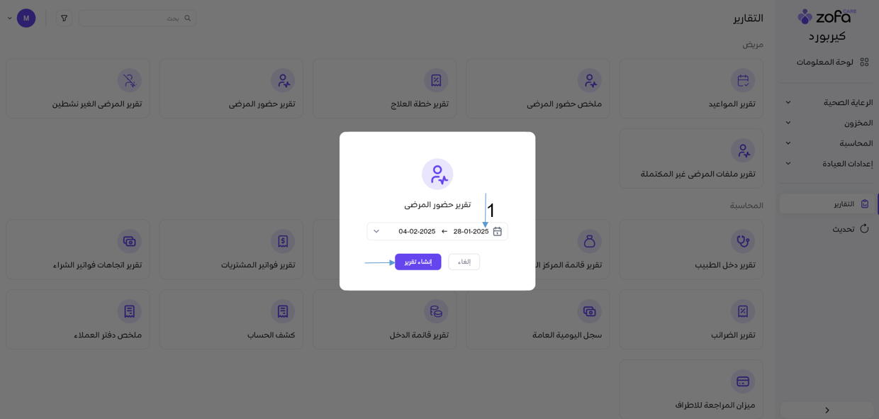 1- الضغط على تقرير ملخص حضور المرضى ثم تحديد المدة الزمنية