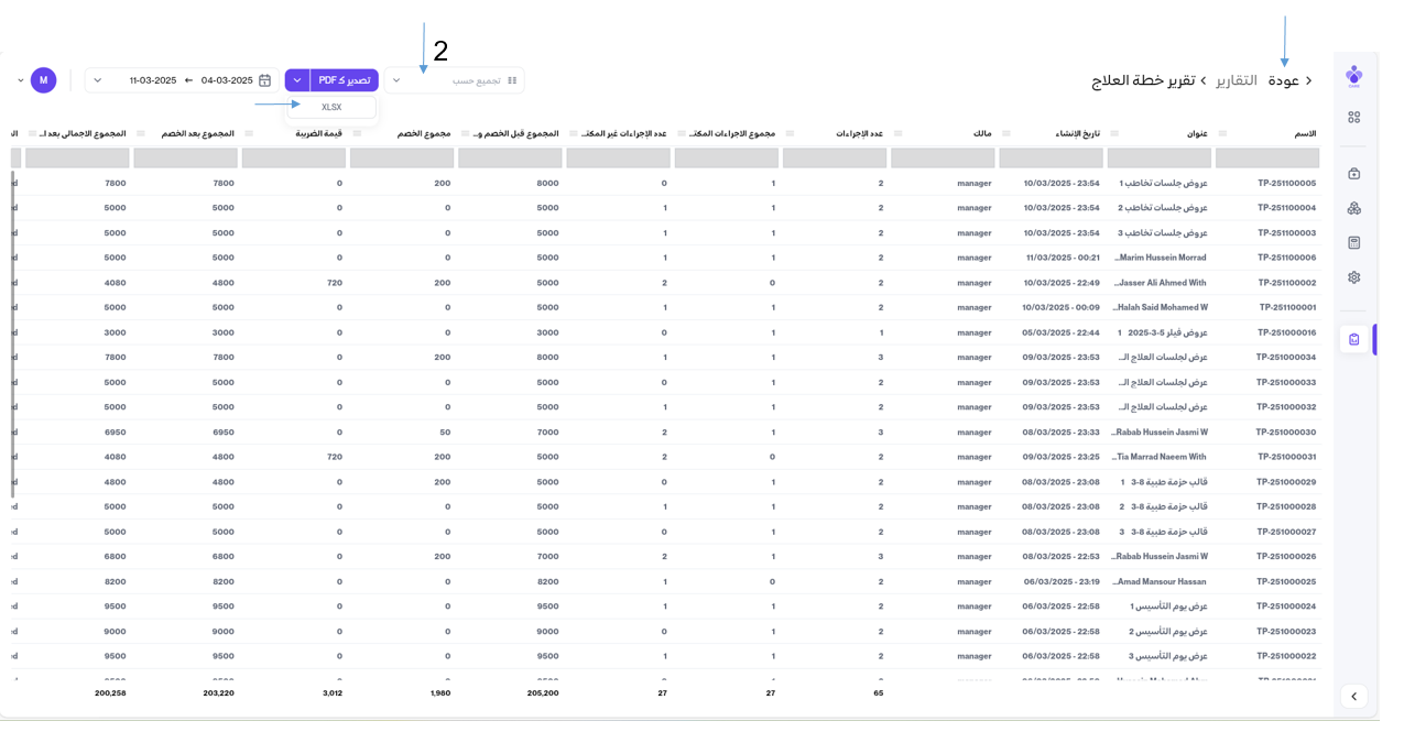 2- يمكنك إظهار التقرير حسب معرف الطبيب أو المريض أو قالب الحزمة الطبية أو المالك