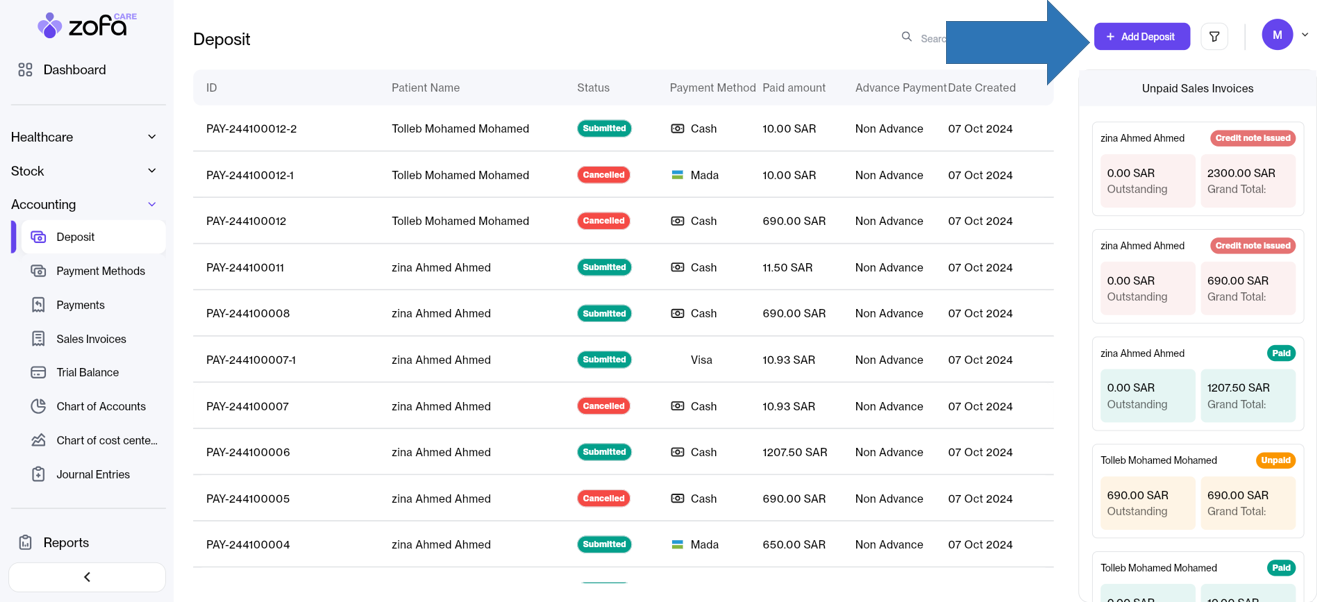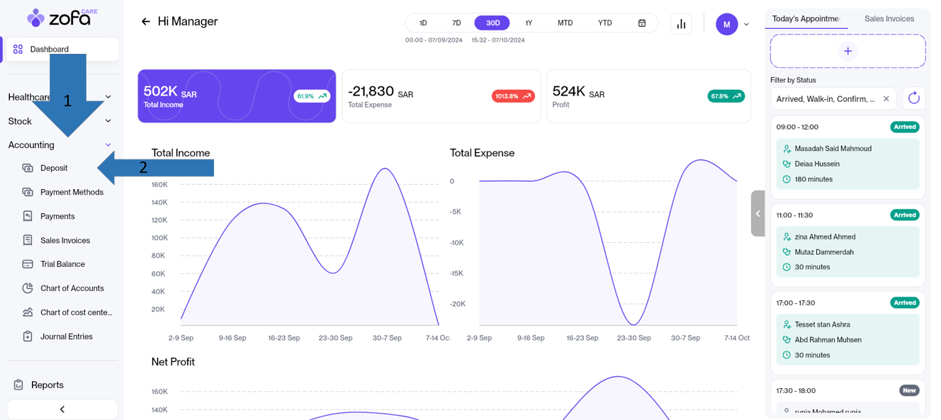 1- Clicking on the Accounting menu 2- Selecting the deposit section