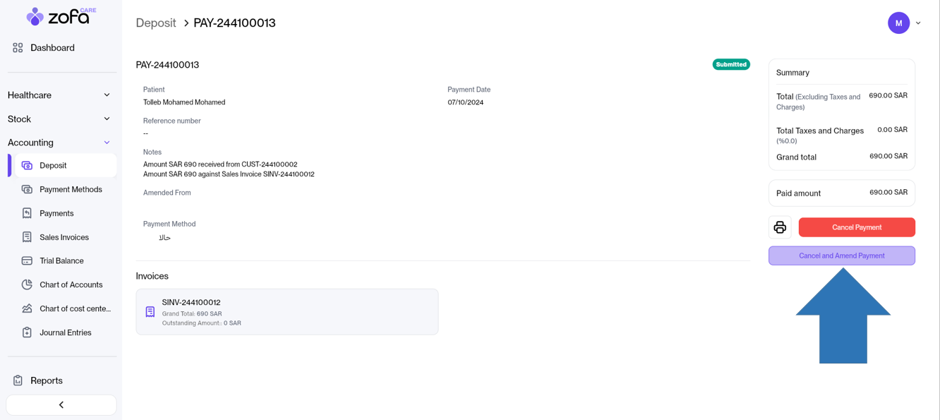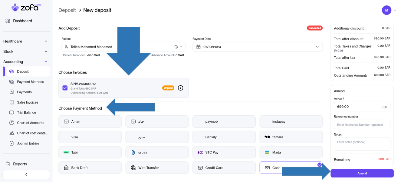 #Finally, select the invoice and the new payment method, then click on 'Amend'#