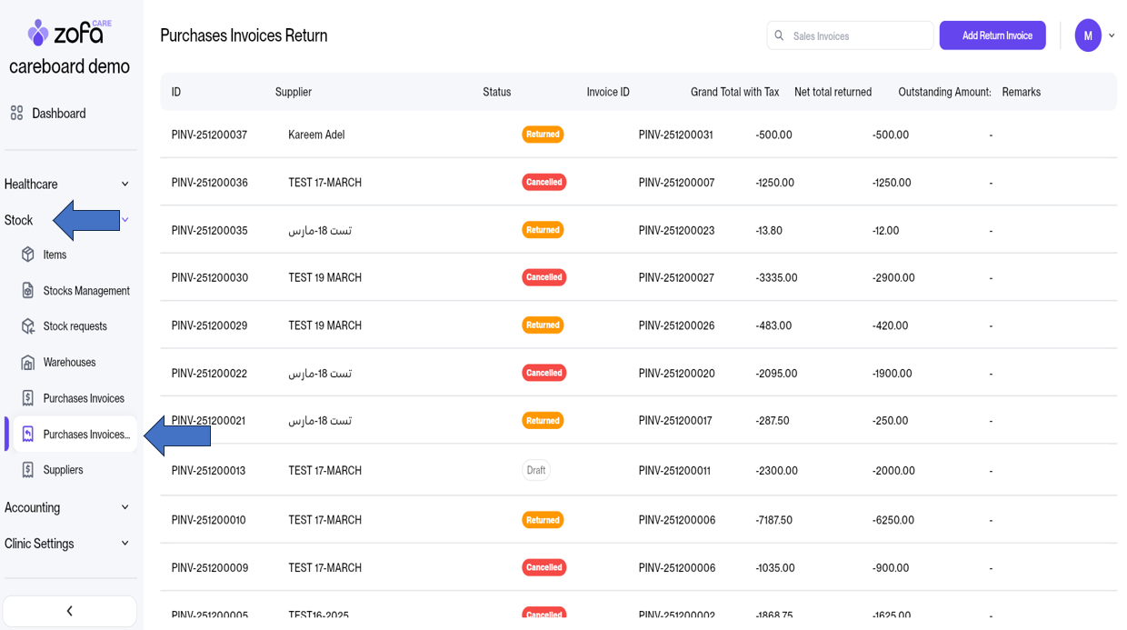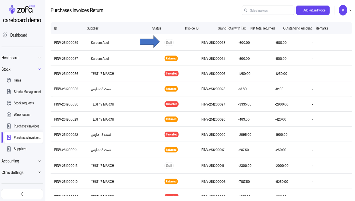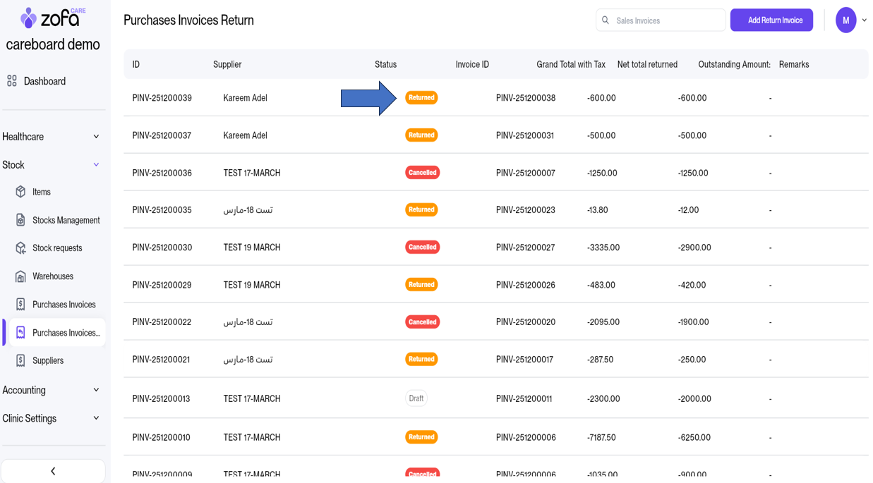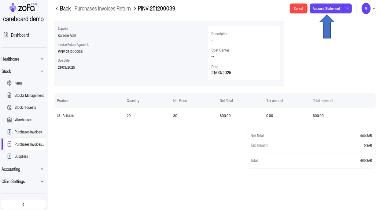 - Finally, if the invoice is opened in the Returned status, we will be able to access the account statement to view the accounting entries related to the returned invoice.