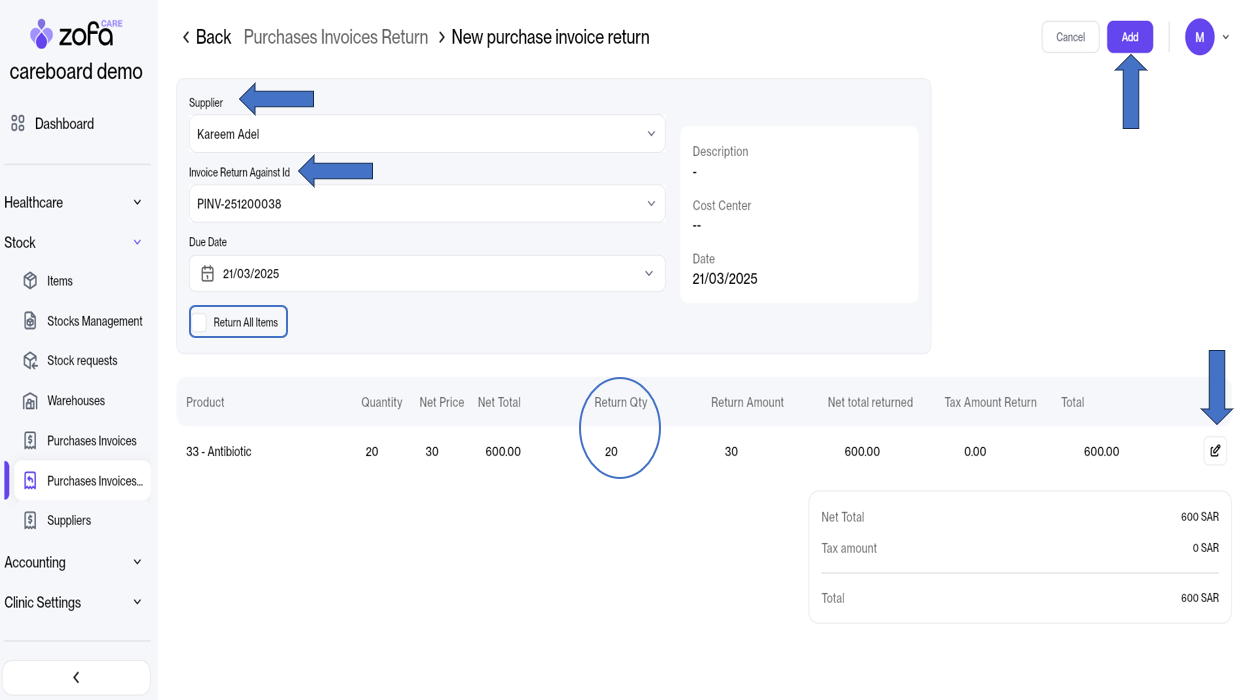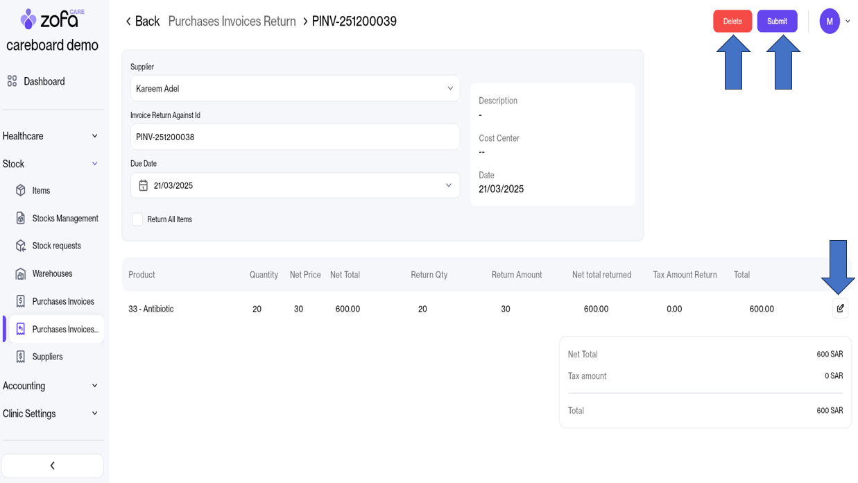 - If you want to return only some items, click on the Edit icon and adjust the return quantity accordingly.