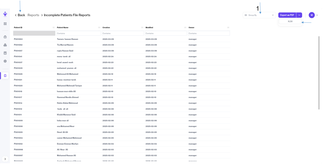 1- You can display the report by Patient ID, Creation, Modified By, and Owner.
