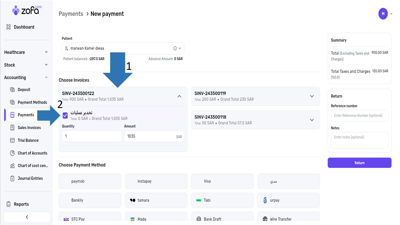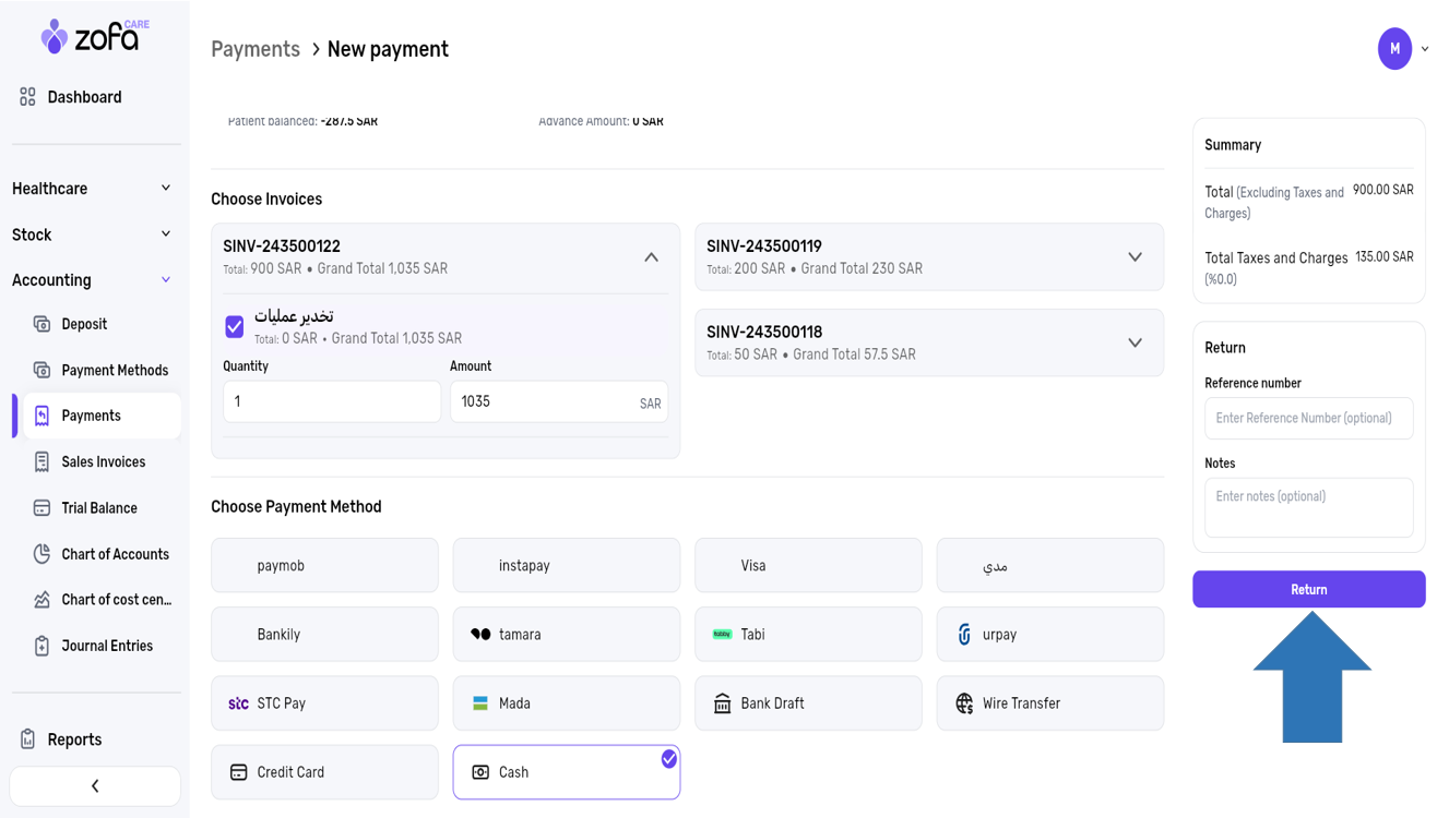 5-Select the needed bill to return, Select the required item, and fill out the stock quantity and amount to be returned, the amount must match the grand total.